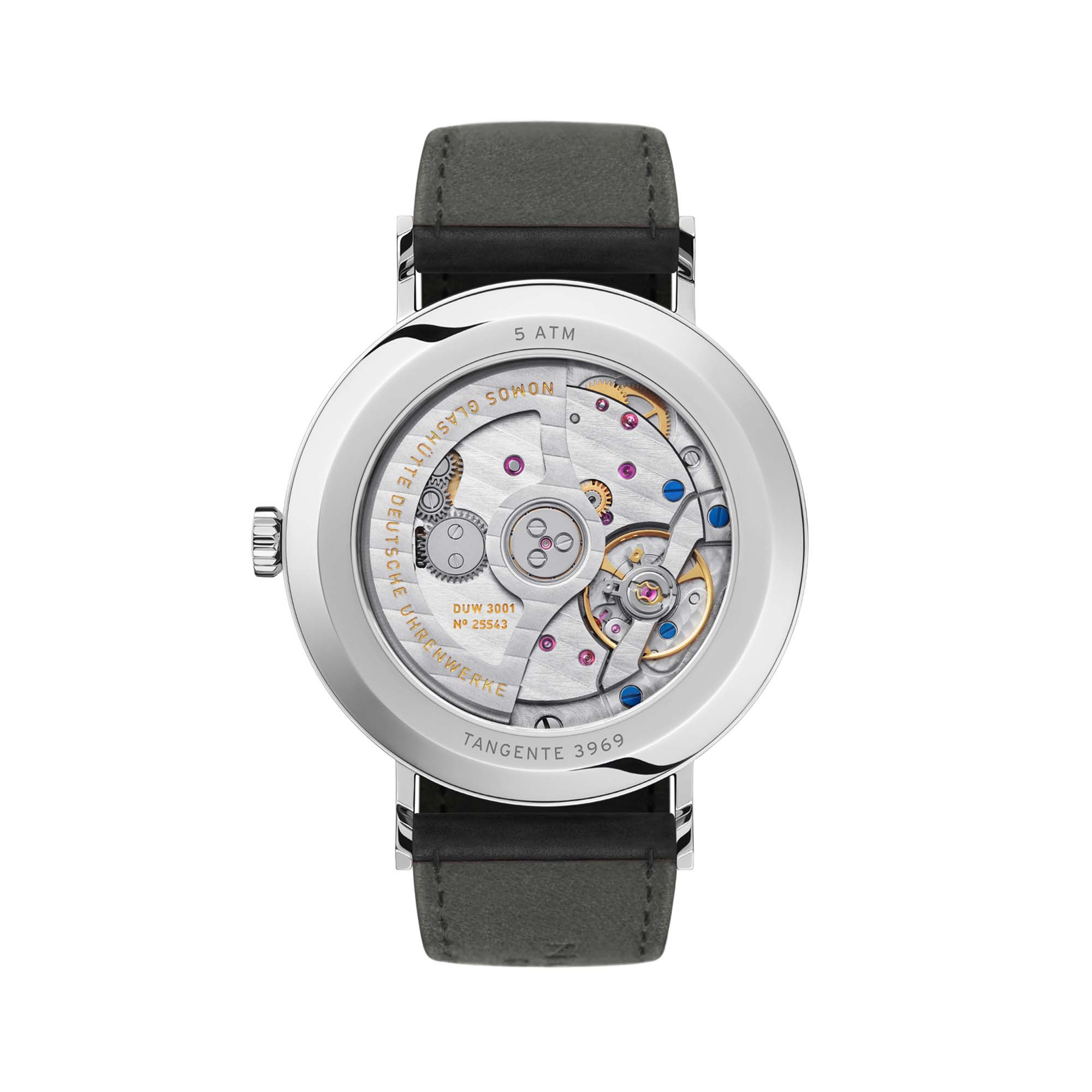 Ref. 144 - Mit Tangente neomatik 39 platingrau hat NOMOS Glashütte eine elegante Automatikuhr geschaffen: voller technischer Raffinessen, von höchster Qualität. Ihr neomatik-Kaliber DUW 3001 passt mit einer Werkhöhe von nur 3,2 Millimetern in das schmale Stahlgehäuse. Der beidseitig aufziehende Rotor nimmt Bewegungsenergie auf und hält bei Vollaufzug – so wird die Aufzugsfeder der langlebigen Uhr geschont. Für beste Ganggenauigkeit sorgt das NOMOS-Swing-System. Reich verziert sind die veredelten Werkoberflächen. Das Platingrau im Zifferblatt betont den Wert der Uhr.
