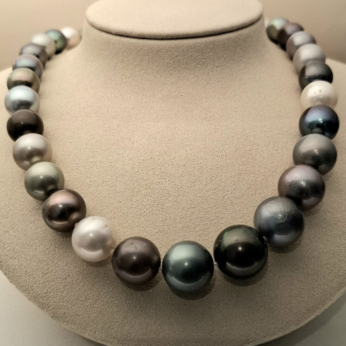 Die Kette besteht aus 35 sorgfältig ausgewählten, runden Zuchtperlen mit Größen von ca. 10,2 bis 12 mm. Ihr charakteristisches Multicolor-Farbspiel – inspiriert vom Harlekin-Stil – kombiniert harmonisch verschiedene natürliche Nuancen und verleiht der Kette eine lebendige, individuelle Ausstrahlung.