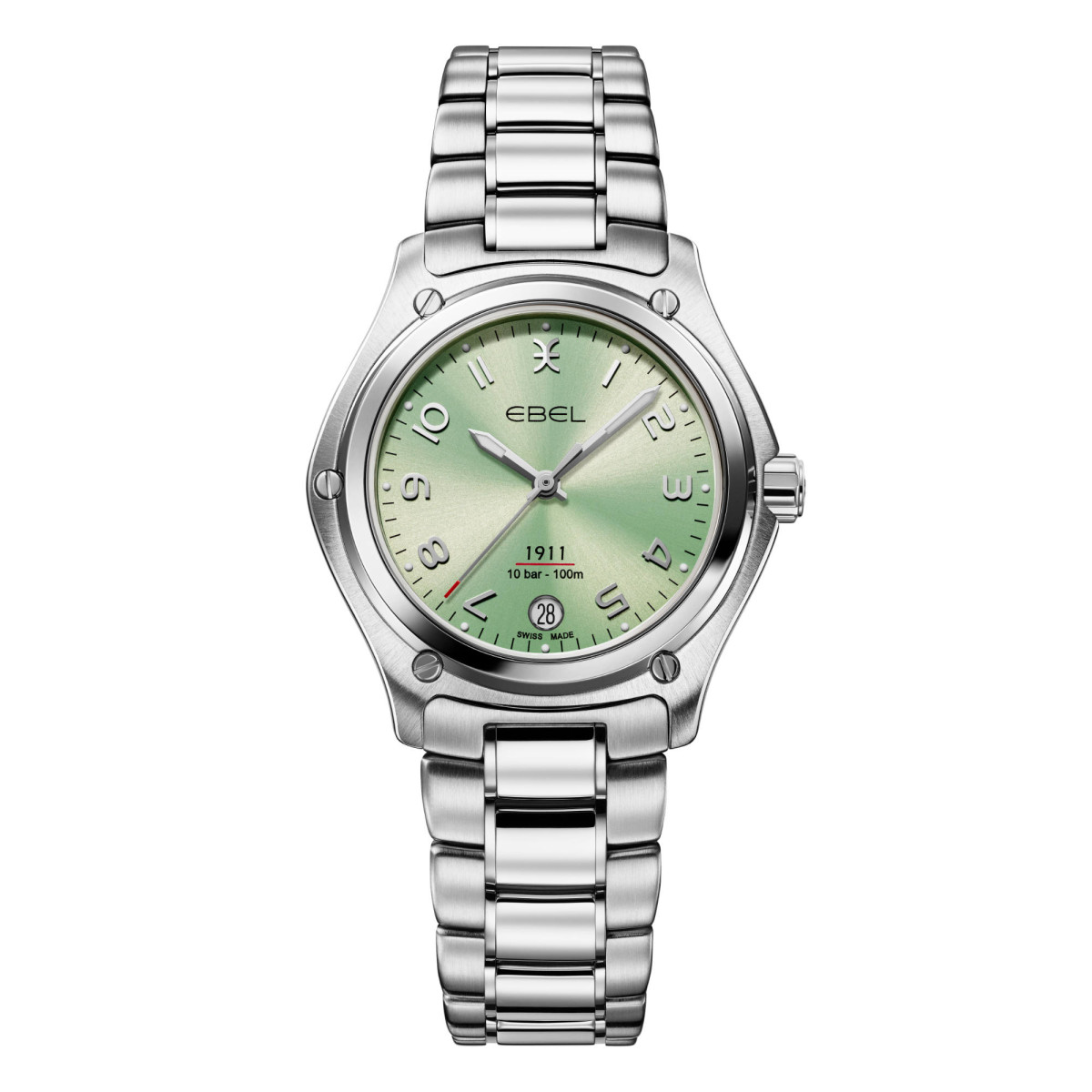 Ref. 1216579 - EBEL 1911 Damenuhr, Gehäuse aus Edelstahl, Ø 34 mm, pastellgrün galvanisiertes Zifferblatt mit arabischen Ziffern, Datumsfenster auf 6:00 Uhr, innenseitig entspiegeltes Saphirglas, Gliederarmband aus Edelstahl, Faltschließe, zusätzliches Gewebeband (hergestellt aus recycletem Kunststoff aus dem Meer) mit Kork-Innenseite, Schweizer Quarzwerk, wasserdicht bis 10 bar.