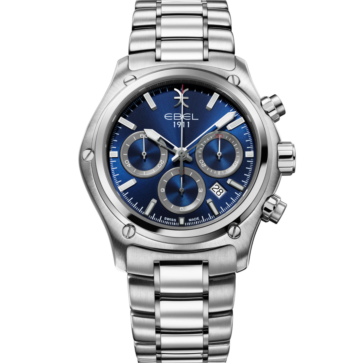 Ref. 1216618 - EBEL 1911 Herrenuhr, Gehäuse aus Edelstahl, Ø 44 mm, blau galvanisiertes Zifferblatt mit applizierten Super-LumiNova® Indizes, Datumsfenster auf 4:30 Uhr, innenseitig entspiegeltes Saphirglas, Gehäuserückseite aus Saphirglas, Armband aus Edelstahl, Faltschließe, zusätzliches schwarzes Kalbslederband, Schweizer Automatik-Chronographenwerk, wasserdicht bis 10 bar.
