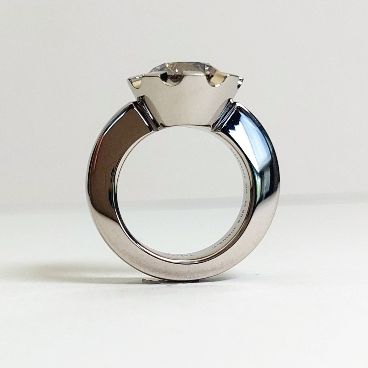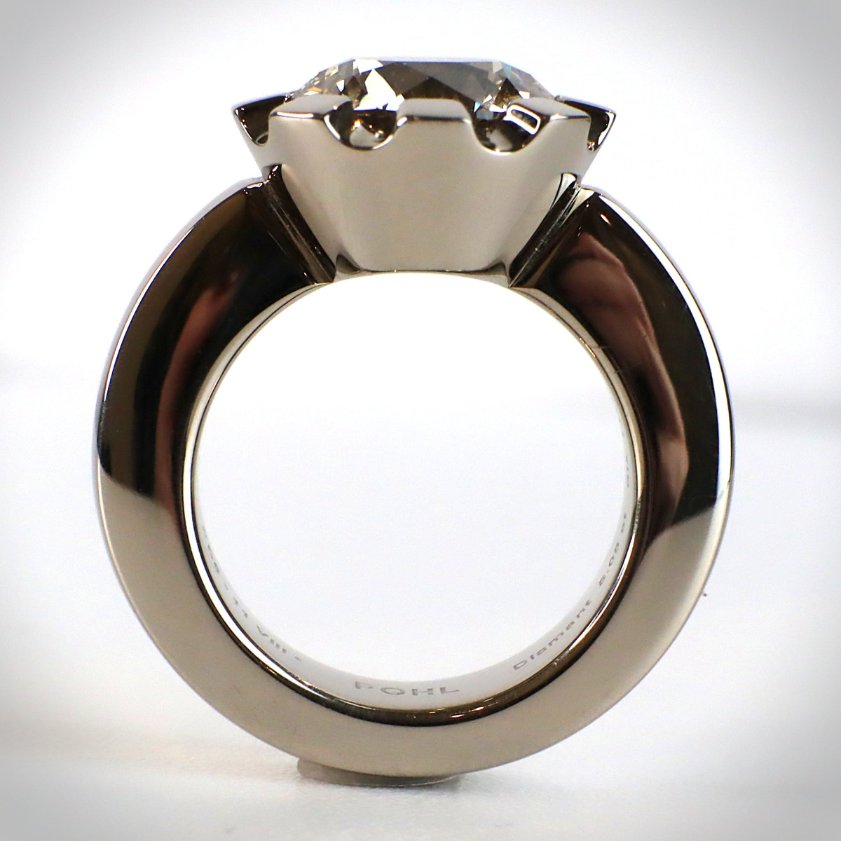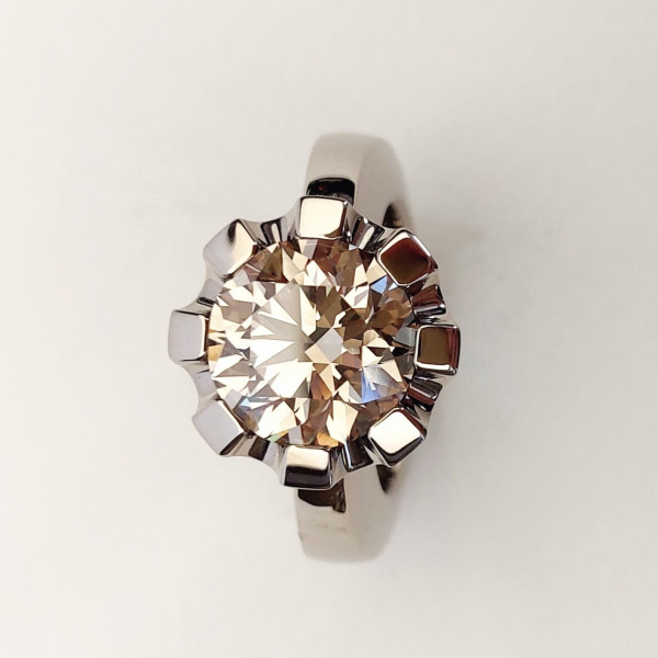 Das kühle, klare Weißgold bildet einen spannungsvollen Kontrast zu den warmen, rauchigen Farbtönen des Diamanten und verstärkt seine besondere Wirkung. Die Gestaltung der Ringschiene ist geradlinig gehalten, um die außergewöhnliche Präsenz des Steins uneingeschränkt in den Mittelpunkt zu stellen.