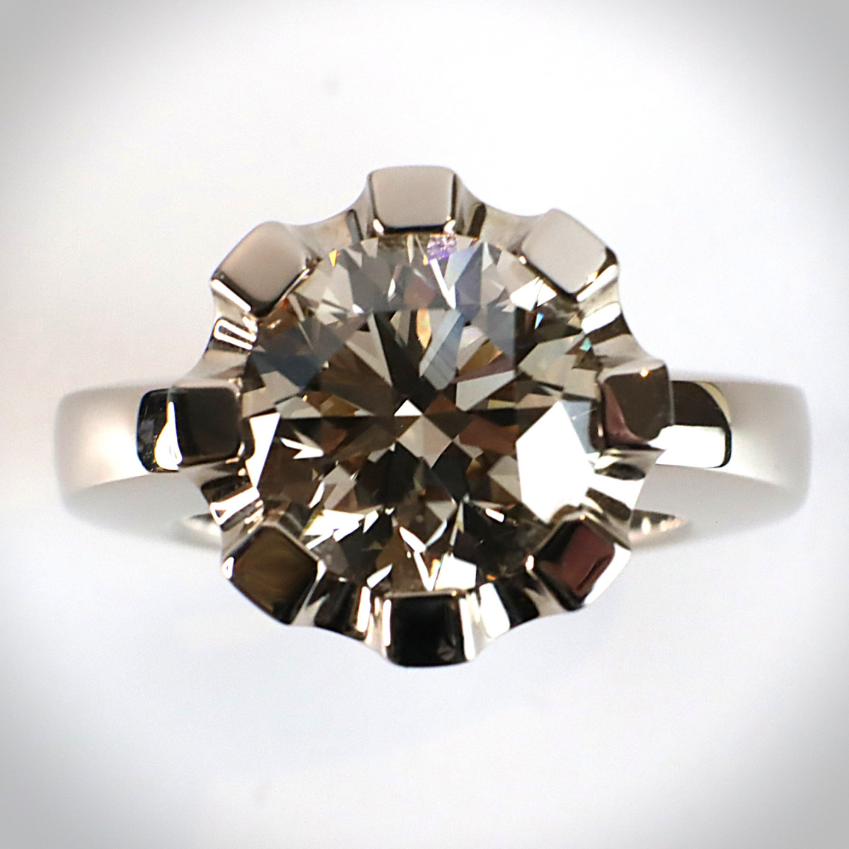 Der eindrucksvolle Diamant zeigt eine "fancy brown" Farbgebung mit einem leicht gräulichen Unterton – eine faszinierende und äußerst seltene Nuance, die Tiefe, Charakter und eine geheimnisvolle Eleganz vereint. Diese besondere Farbkomposition wirkt edel, erdig und zugleich erfrischend modern. Durch die präzise Fassung wird das natürliche Feuer des Old Mine Cut eindrucksvoll hervorgehoben.