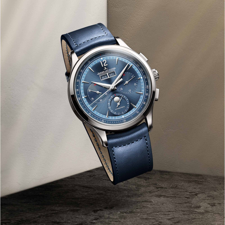 Ref. 4138180 - Die Master Control Chronograph Calendar folgt den Traditionen der runden Uhren, die in den 1950er-Jahren äußerst beliebt waren. Das zweifarbige Zifferblatt in einem doppelt gebürsteten und polierten Gehäuse garantiert eine hervorragende Ablesbarkeit der Funktionen (Stunden, Minuten, kleine Sekunden) sowie der Komplikationen, insbesondere des Chronographen mit seiner pulsometrischen Skala und dem 30-Minuten-Zähler. Unter dem Saphirglasboden ist das manufaktureigene Kaliber 759 zu sehen, das eine Gangreserve von 65 Stunden verspricht. Die Master Control Chronograph Calendar wird mit verschiedenen auswechselbaren Armbändern angeboten – eins mit Gliedern aus Edelstahl, das andere aus blauem Leder – so kann ihr Erscheinungsbild mit wenigen Handgriffen verändert werden und sie bleibt immer auf der Höhe der Zeit.