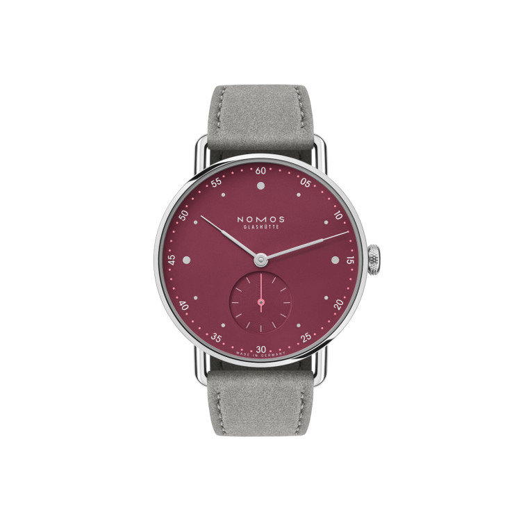 Ref. 1123 - Einige der wichtigsten Punkte auf der To-do-Liste einer Metropolenbewohnerin finden sich auf diesem weinroten Zifferblatt. Die kleinsten sind in selbstbewusstem Rosa gehalten – wie auch der Sekundenzeiger von Metro 33 muted red. Die vielfach preisgekrönte mechanische Uhr im Design von Mark Braun hier mit Handaufzug und in der smarten Größe von nur 33 Millimeter Durchmesser in Edelstahl. Weil Großstadtleben einfach schön sein kann!