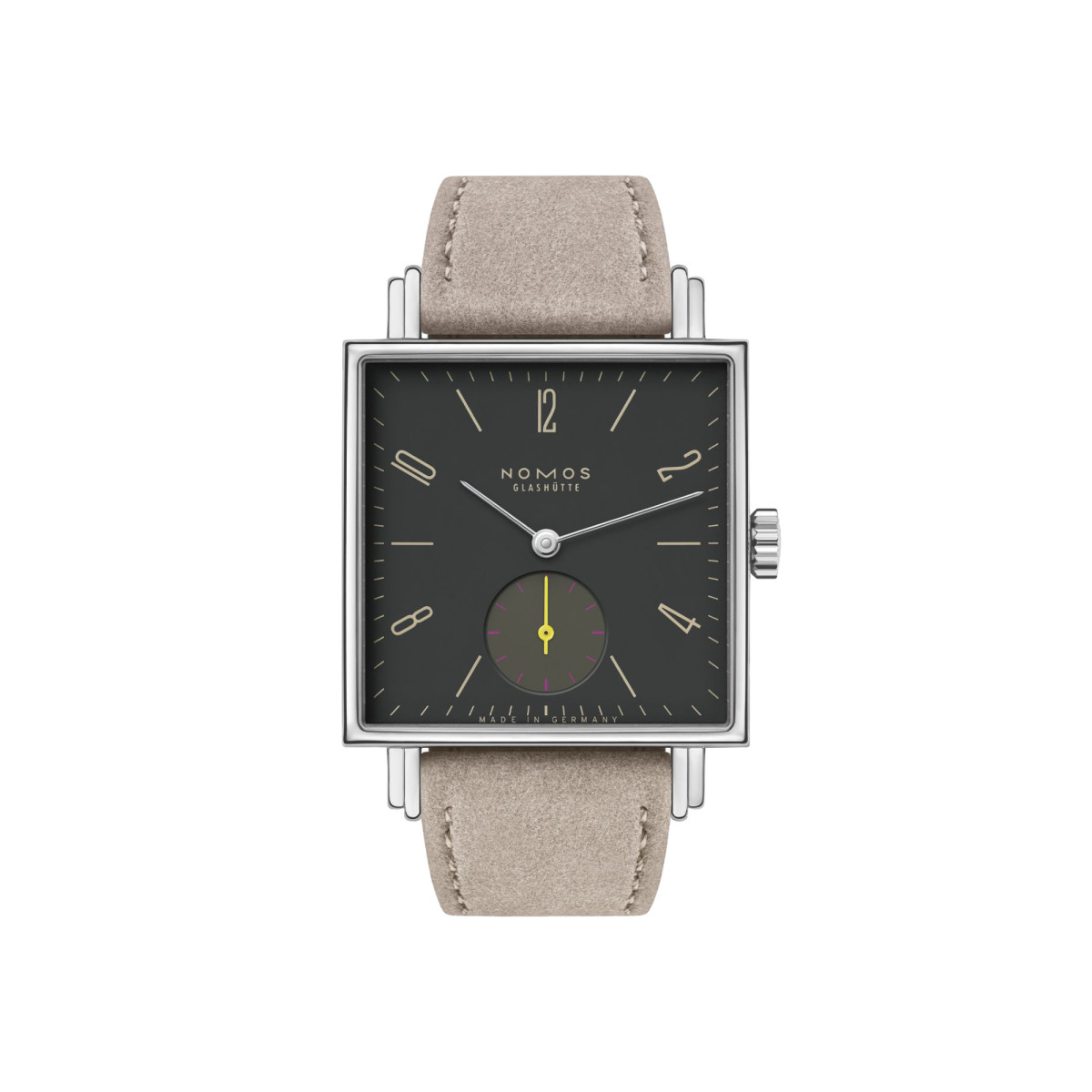 Ref. 440 - Diese außergewöhnliche Uhr in Anthrazit verbindet elementare Schönheit mit der Reinheit der Form. Der vulkanische Farbton hat Tiefe und fällt zugleich ins Auge, er bildet einen Kontrast zum glänzenden Edelstahl des Gehäuses und verleiht der quadratischen Silhouette Kraft und Charisma. Tetra Basalt hat Persönlichkeit und verfügt über die dauerhafte Modernität guten Designs. Das mechanische Kaliber im Inneren genießt Glashütter Herkunftsschutz.