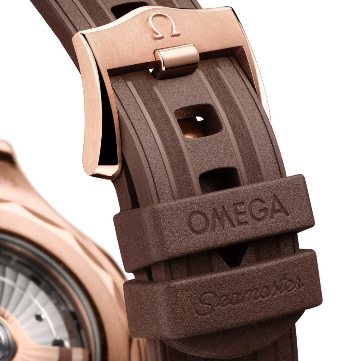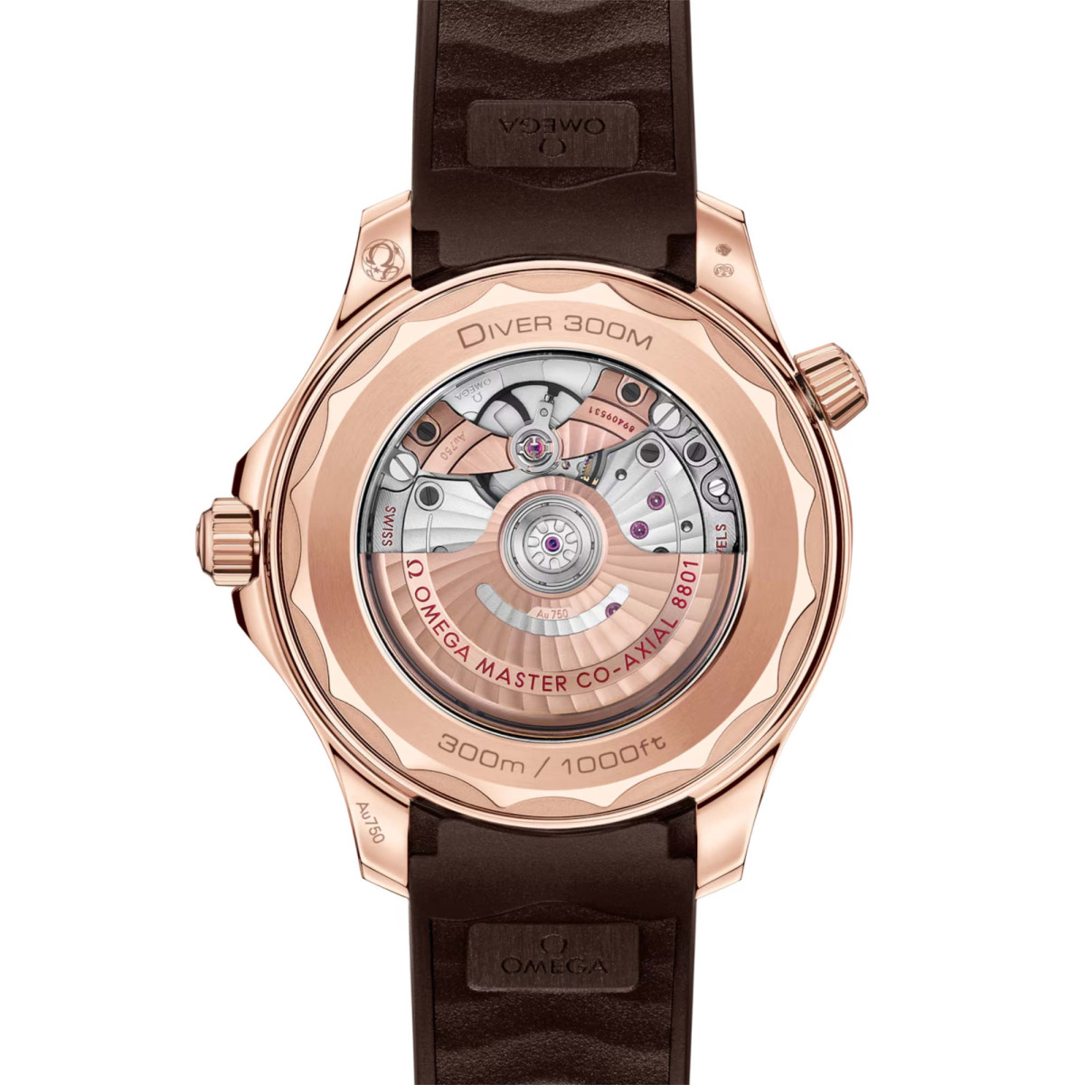 Angetrieben wird die Uhr mit braunem Kautschukarmband von dem OMEGA Master Chronometer Kaliber 8801, das durch das Saphirglas des Gehäusebodens mit gewelltem Rand bewundert werden kann.