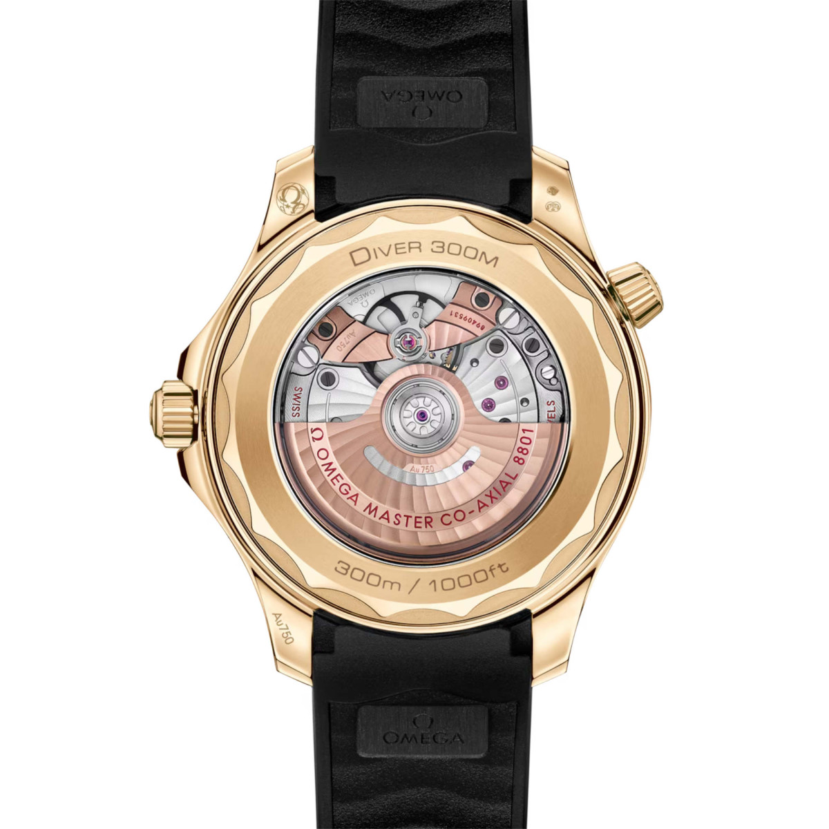 Angetrieben wird die Uhr mit schwarzem Kautschukarmband vom OMEGA Master Chronometer-Kaliber 8801, das durch das Saphirglas des Gehäusebodens mit gewelltem Rand bewundert werden kann.