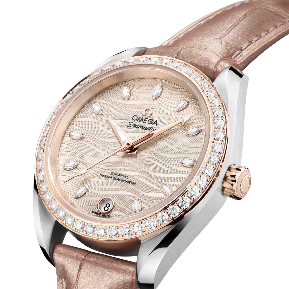Ref. 220.28.34.20.59.001 - Mit Stundenindizes aus Edelsteinen ist diese Seamaster Aqua Terra für Damen der Inbegriff der Eleganz. - Die schöne OMEGA Seamaster mit 34 mm Durchmesser besitzt ein symmetrisches Gehäuse aus Edelstahl und 18 K Sedna™-Gold sowie eine polierte, diamantbesetzte Lünette. Das nudefarbene Zifferblatt mit Wellendekor ist mit zentralen Zeigern für Stunden, Minuten und Sekunden aus diamantpoliertem 18 K Sedna™-Gold, einem Datumsfenster bei 6 Uhr und 11 Diamanten im Marquiseschliff als Stundenindizes ausgestattet. - Die Uhr mit beigefarbenem, glänzendem Lederarmband wird von dem OMEGA Co-Axial Master Chronometer Kaliber 8800 angetrieben, das von dem Eidgenössischen Institut für Metrologie (METAS) gemäß den höchsten Branchenstandards zertifiziert wurde.