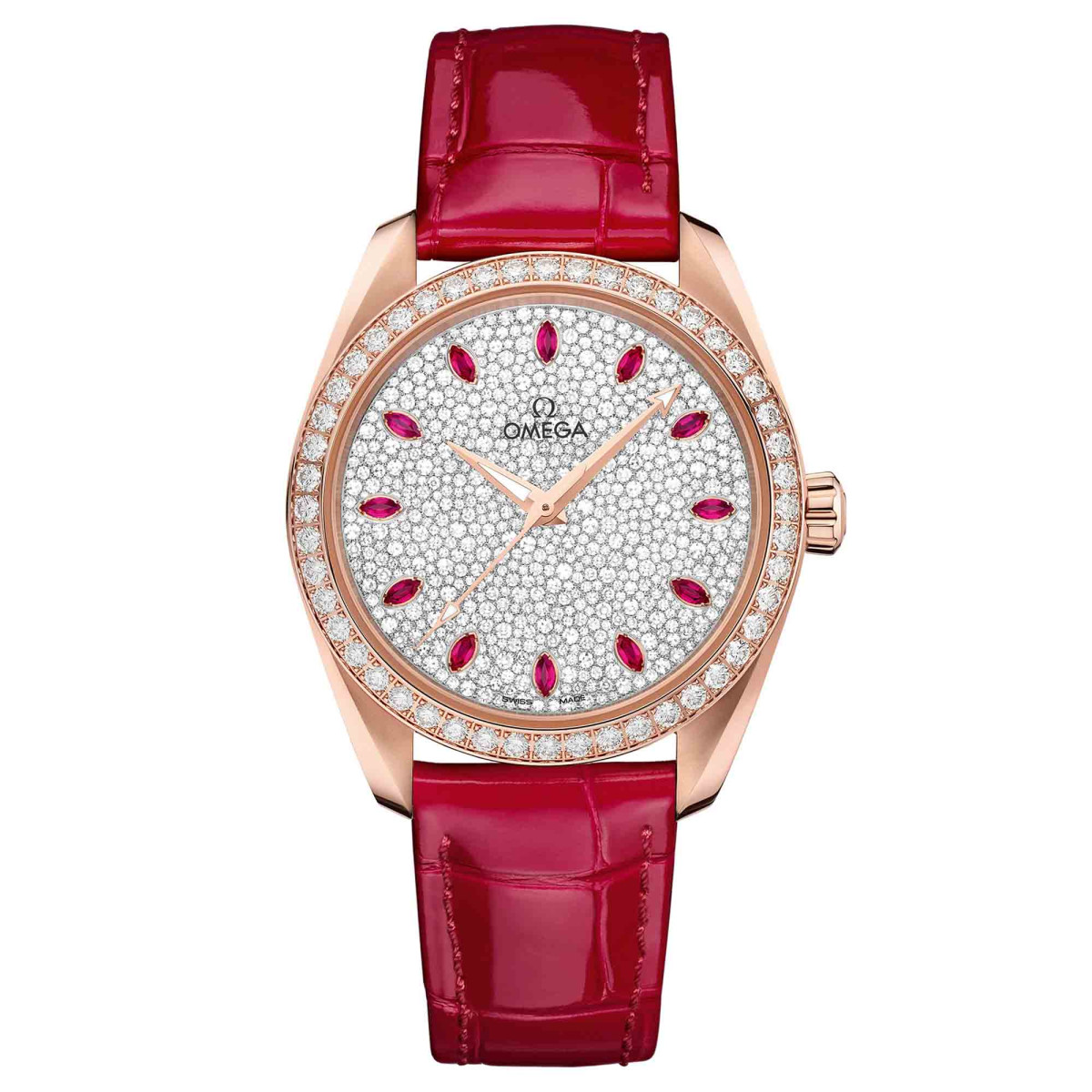 die Stundenindizes mit roten Rubinen im Marquiseschliff