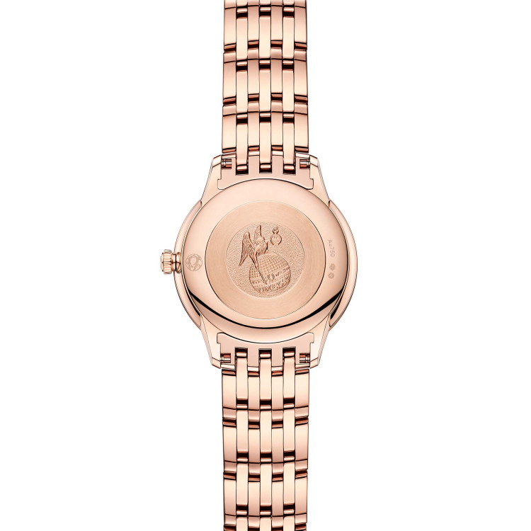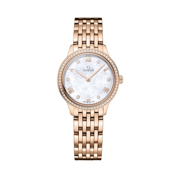 Ref. 434.55.28.60.55.001 - Die OMEGA De Ville Prestige ist seit 1994 eine zeitlose Kollektion. Jetzt erscheint die dritte Generation der Ikone. Mit einer Auswahl an Mustern, Veredelungen und Farben repräsentieren diese Zeitmesser klassisches Design sowie Eleganz und passen sich verschiedensten Lifestyles und Persönlichkeiten an. Dieses 27,5-mm-Modell aus 18 K Sedna™-Gold mit diamantbesetzter Lünette besitzt ein Zifferblatt aus weißem Perlmutt. Die Anzeige zeichnet sich durch Zeiger mit PVD-Beschichtung aus Sedna™-Gold sowie alternierende römische Ziffern und Diamantindizes in Halterungen aus 18 K Sedna™-Gold aus. Der schlichte Look des Zeitmessers wird durch einen soliden Gehäuseboden mit einer Prägung des Gottes Chronos ergänzt. Die Uhr wird von einem Armband aus 18 K Sedna™-Gold am Handgelenk gehalten und von dem OMEGA Quarzkaliber 4061 mit einer Batterielaufzeit von mindestens 48 Monaten angetrieben