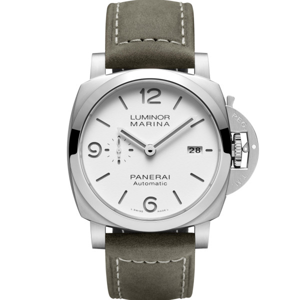Ref. PAM01314 - Das Gehäuse der Luminor Marina – 44 mm ist aus AISI 316L-Stahl, einem besonders korrosionsbeständigen kohlenstoffarmen Hochleistungsmetall, gefertigt. Es greift mit seinen klaren, kantigen Linien das charakteristische Design der Luminor Modelle der 1990er Jahre auf. Das Zifferblatt der Luminor Marina - 44 mm verfügt über eine Sandwichstruktur, die mittlerweile zur Signatur der Marke geworden ist. Diese Innovation wurde von Panerai Ende der 1930er-Jahre für Taucheruhren der Royal Navy eingeführt. Der bedeutsame Bezug zur Tradition wird durch die Verwendung der neongrünen Leuchtmasse Super-LumiNova ™ bei Indizes und Zeigern unterstrichen.