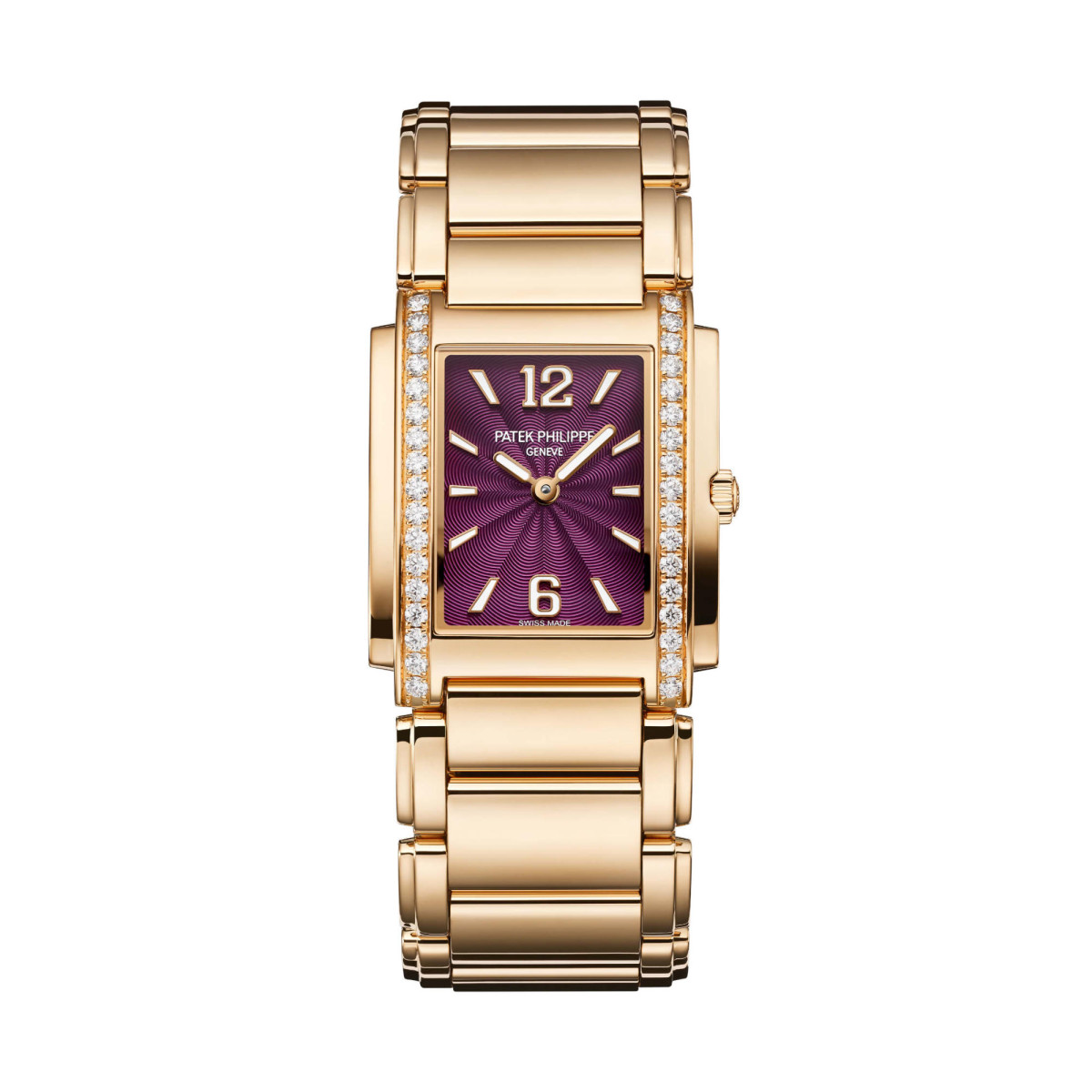 Ref. 4910/1201R-010 - Zur Feier des 25-jährigen Jubiläums der Damenuhrkollektion Twenty~4 – heute Inbegriff zeitloser Eleganz – führt Patek Philippe nun ein neues „Manschetten“-Modell mit Quarzwerk und besonders raffiniertem Zifferblatt ein. Zunächst wird auf die Zifferblatt-Rondelle ein Motiv mit konzentrischen Wellen geprägt. Darauf werden dann Dutzende von Schichten violetten Lacks und Transparentlacks aufgetragen, die eine faszinierende Tiefenwirkung erzeugen.