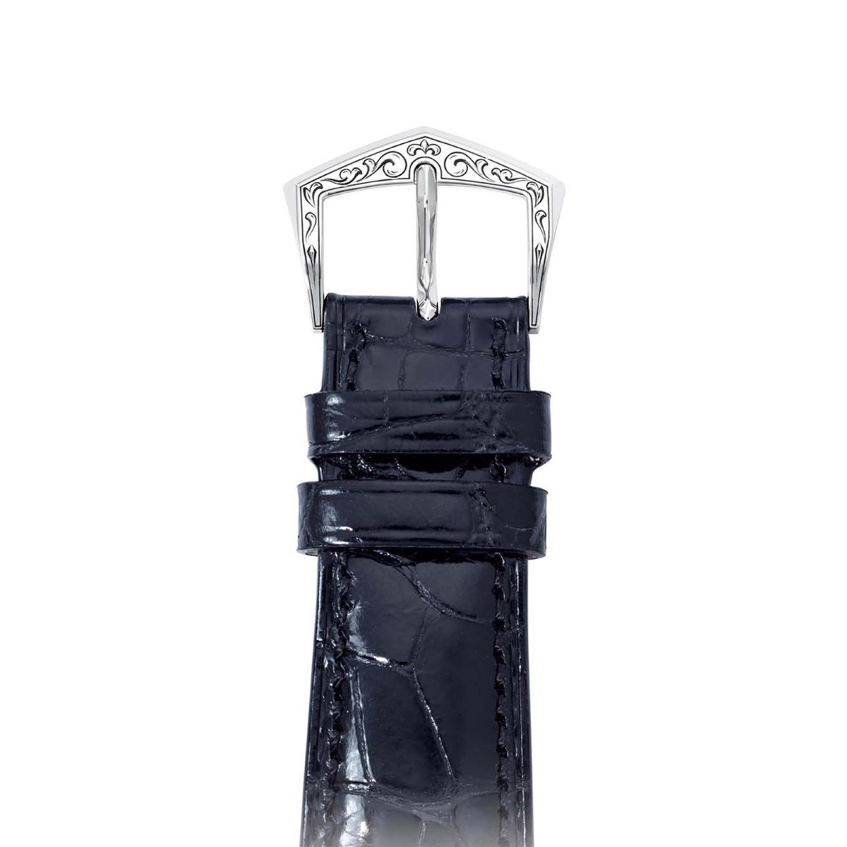 Alligatorleder schwarz glänzend. Handgravierte Dornschließe
