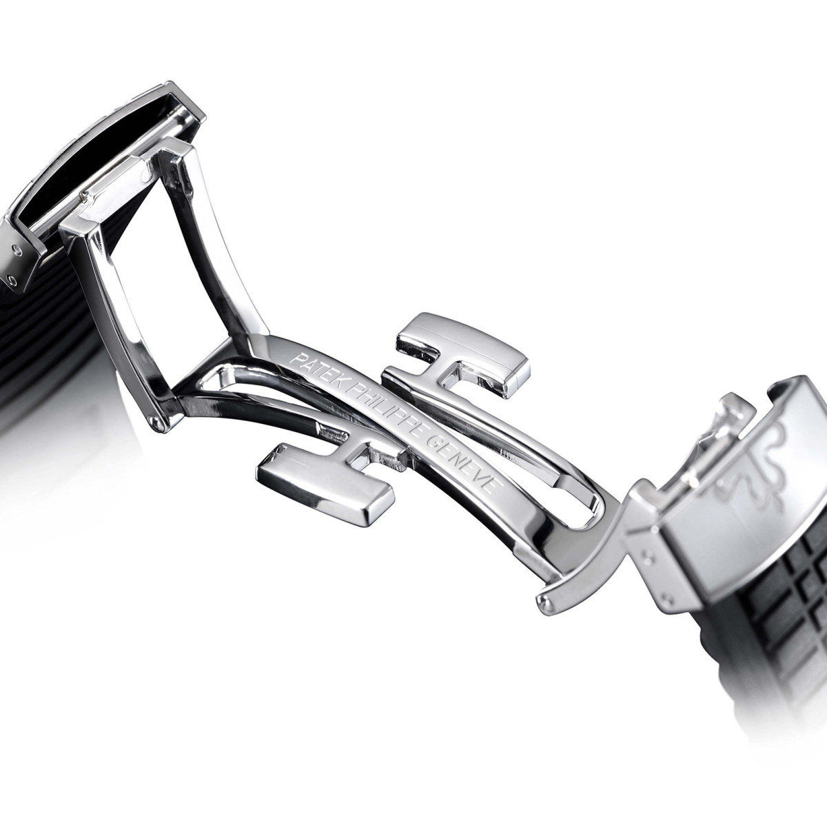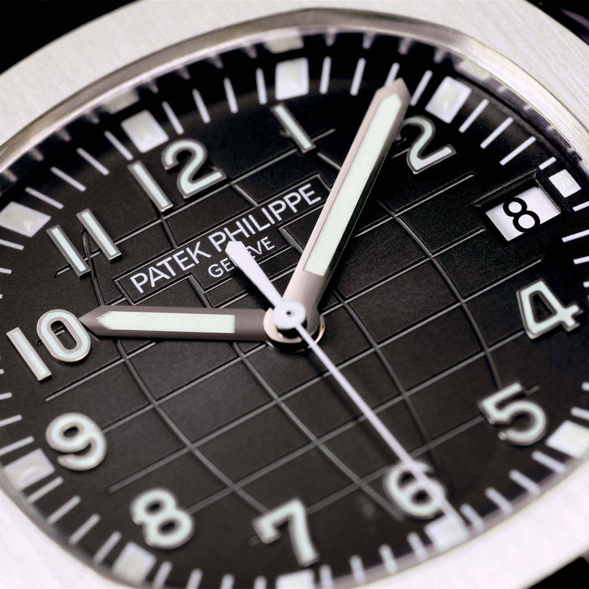 Ref. 5167A-001 - Mit der Präsentation der Linie Aquanaut interpretierte Patek Philippe 1997 das legendäre Design der Nautilus auf junge und moderne Weise neu. Dieses Modell in sportlich, dynamischer Optik verfügt über ein bis 12 BAR/ATM wasserdichtes Edelstahlgehäuse mit verschraubter Krone. Blickfang sind das schwarze Zifferblatt mit Prägedekor, welches sich im neu entwickelten "Tropical"-Armband wiederfindet. Dieses Band wird aus einem neuartigen Verbundmaterial hergestellt, das, neben den wasser- und abriebfesten Eigenschaften, zusätzlich unempfindlich gegen UV Strahlen ist. Im Inneren des 40mm im Durchmesser messenden Gehäuses arbeitet das Patek Philippe Automatik-Manufakturwerk 324 S C.