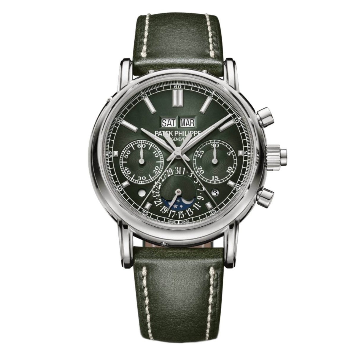 Ref. 5204G-001 - Neue Weißgold-Interpretation mit olivgrünem Zifferblatt. Der Schleppzeiger-Chronograph Referenz 5204 mit ewigem Kalender kombiniert zwei der berühmtesten Grandes Complications von Patek Philippe und ist seit 2021 in einer Version aus Roségold mit schiefergrauem Zifferblatt und Armband erhältlich (5204R-011).