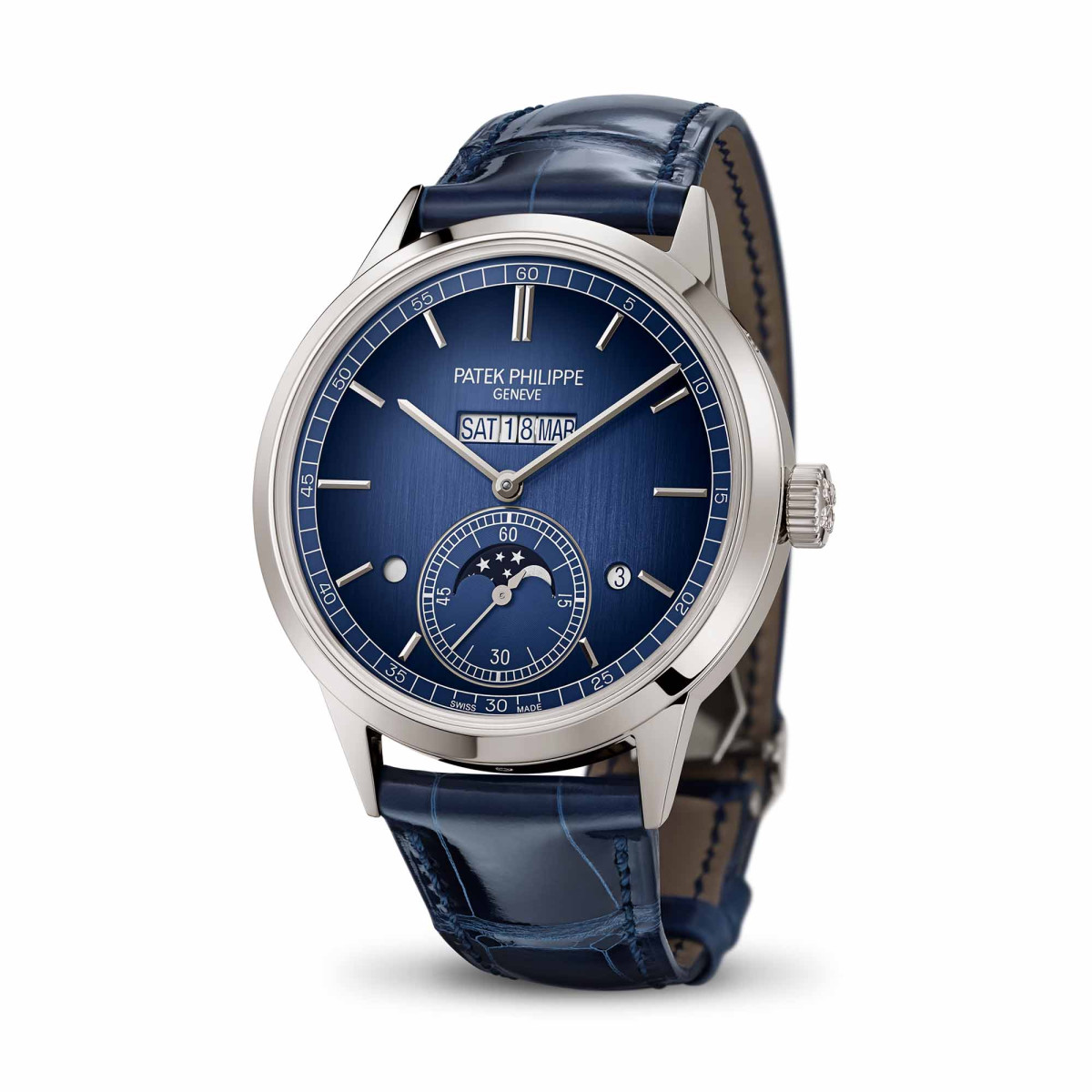Ref. 5236P-001 - Patek Philippe ergänzt sein breit gefächertes Kalenderuhrensortiment um einen ganz neuen ewigen Kalender mit innovativer Anzeige-Linie. Tag, Datum und Monat sind hier in einem einzigen großen Fenster bei 12 Uhr untergebracht. Um eine originelle, aber auch gut ablesbare und zuverlässige Uhr anbieten zu können, entwickelten die Konstrukteure das mechanische Uhrwerk 31-260 PS QL mit automatischem Aufzug und passendem Zusatzmodul für die Anzeige auf einer Linie. Darauf wurden drei Patente angemeldet. Diese neue Grande Complication wurde passgenau in ein elegantes Platin-Gehäuse eingefügt und mit einem Zifferblatt in Blau mit Schwarz-Verlauf und vertikalem Satinschliff kombiniert.