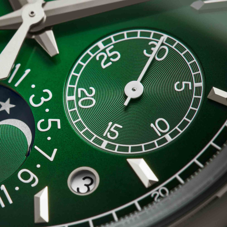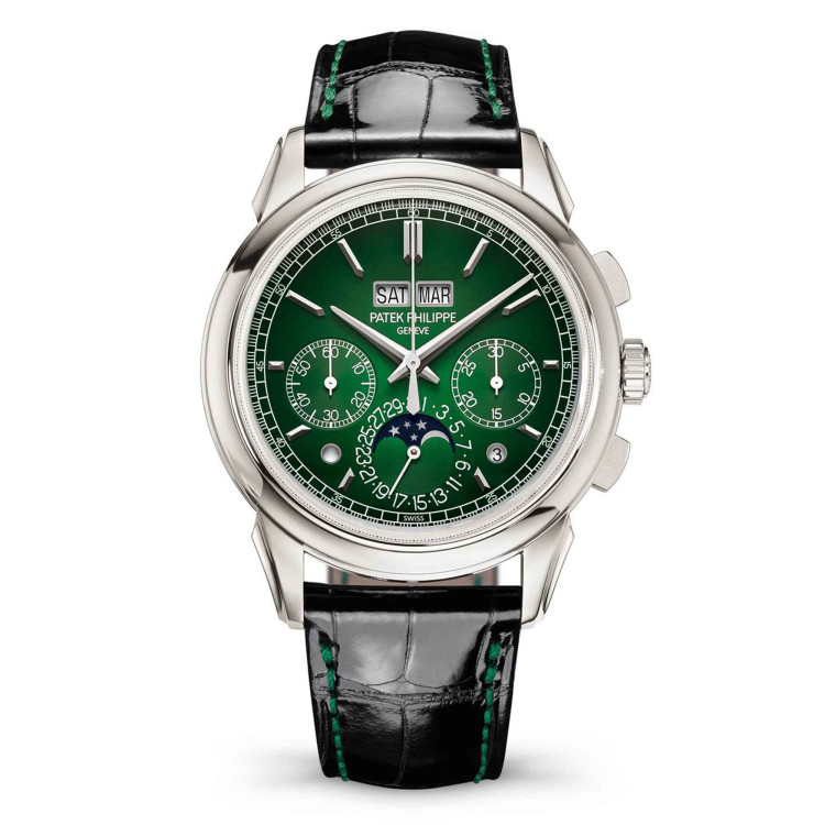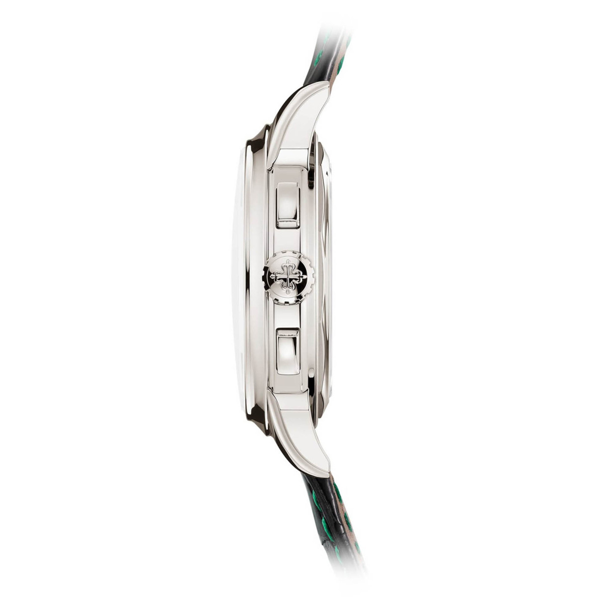 Ref. 5270P-014 - Die 2011 eingeführte Referenz 5270 ist die Nachfolgerin mehrerer Generationen von Patek Philippe Chronographen mit ewigem Kalender. Die Manufaktur legt diesen Zeitmesser in einem Modell neu auf, dessen Stil zugleich ikonisch und originell ist. Der Glanz von Platin, dem wertvollsten aller Metalle, das aber auch am schwierigsten zu bearbeiten ist, veredelt das zeitlose Design des Gehäuses mit seiner konkaven Lünette, den elegant geschweiften Armbandbefestigungen und den Drückern, die an den Flanken satiniert und oben poliert sind. Die Anzeigen für den ewigen Kalender sind harmonisch angeordnet, mit einem Zeigerdatum und einer Mondphase bei 6 Uhr sowie einem Doppelfenster für Wochentag und Monat bei 12 Uhr, ergänzt durch zwei kleine, runde Fenster für die Tag/Nachtanzeige und den Schaltjahrzyklus. Das Kaliber CH 29-535 PS Q zeichnet sich durch seine traditionelle Architektur in Verbindung mit sechs patentierten Innovationen auf Chronographenebene sowie durch seinen außergewöhnlich flachen Kalendermechanismus aus.