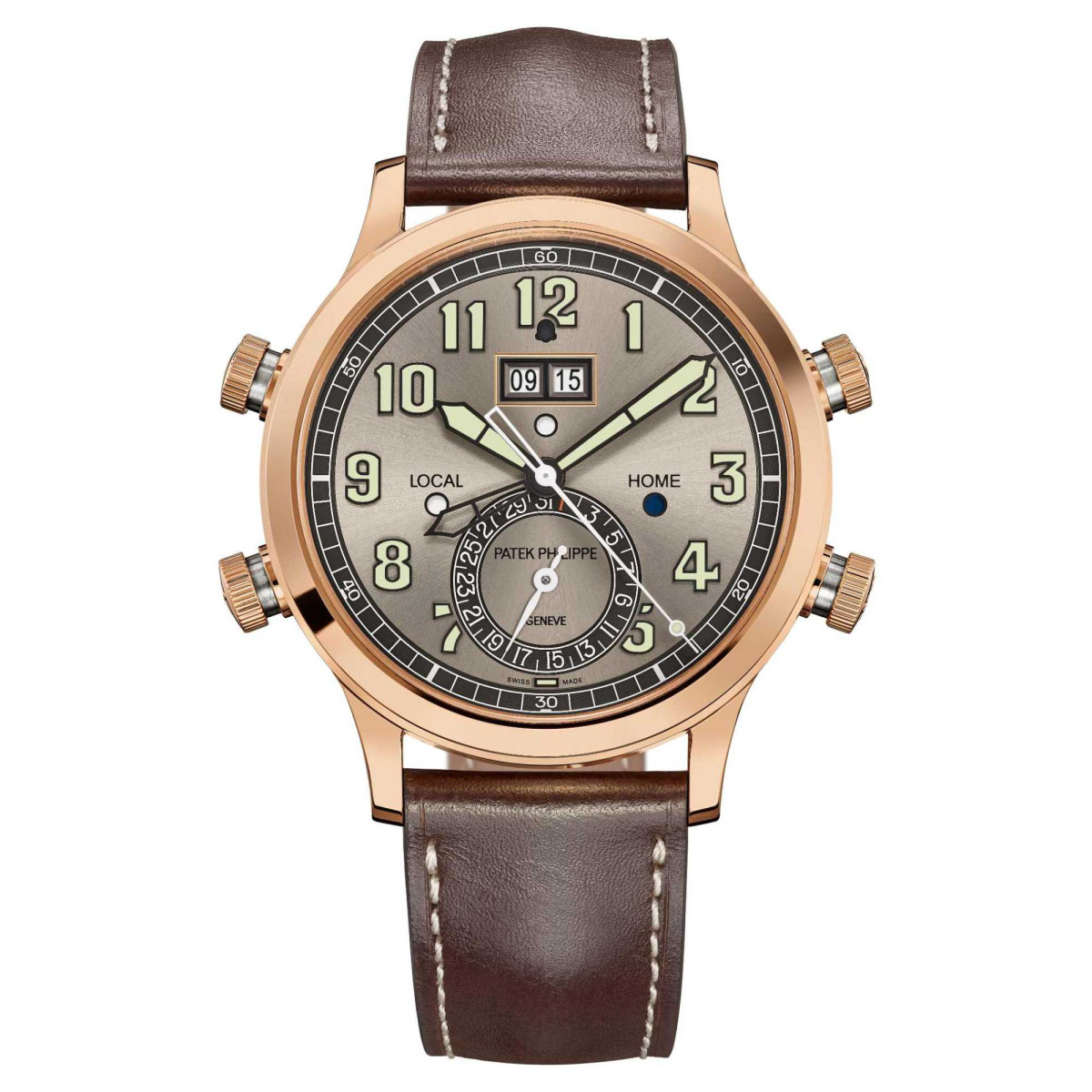 Ref. 5520RG-001 - Die Alarm Travel Time (Referenz 5520) ist die Quintessenz der Reiseuhr. Jetzt präsentiert Patek Philippe eine neue zweifarbige Variante dieses Modells mit einem Gehäuse aus Roségold, vier Drückerrohren aus Weißgold und einem grauen Zifferblatt mit „Sonnenschliff“.