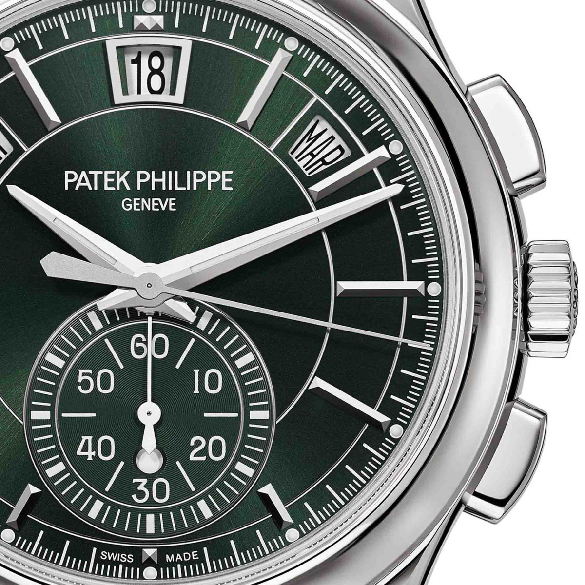 Ref. 5905/1A-001 - Die Referenz 5905 mit automatischem Aufzug, Flyback-Chronograph und Jahreskalender, wird erstmals in Stahl lanciert. Das Zifferblatt besticht durch ein olivgrünes Sonnenschliff-Motiv. Das integrierte Armband wird durch seine polierten und satinierten Kontrastfinissierungen zum Blickfang. Dank der Vertikalkupplung kann der Chronographenzeiger aus der Mitte auch dauerhaft als Zentralsekunde genutzt werden. Der patentierte Jahreskalender berücksichtigt automatisch, ob ein Monat 30 oder 31 Tage hat. Er muss nur einmal jährlich (am 1. März) korrigiert werden.