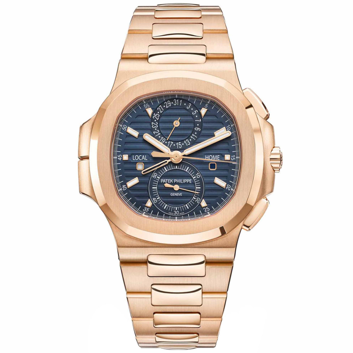 Ref. 5990-1R-001 - Patek Philippe bietet die Nautilus Travel Time Chronograph Referenz 5990/1 jetzt in einer großzügigeren Ausführung aus Roségold an. Dieser Goldton steht in reizvollem Gegensatz zum blauen Zifferblatt mit „Sonnenschliff‟, horizontaler Reliefprägung und aufgesetzten Indexen. Die Stabzeiger mit Leuchtbeschichtung sind aus Roségold gefertigt. Diese Innovation verbindet drei sehr beliebte Komplikationen: einen Flyback-Chronographen mit automatischem Aufzug, eine besonders einfach anwendbare Travel Time Funktion (zwei Zeitzonen) sowie eine Datumsanzeige mittels Zeiger, die mit der Ortszeit gekoppelt ist.