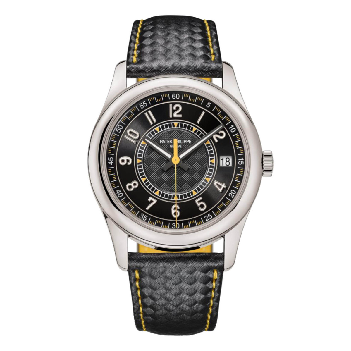 Schwarzes Kalbslederband mit aufgeprägtem "Karbon-Motiv", gelbe Nähte. Dornschließe