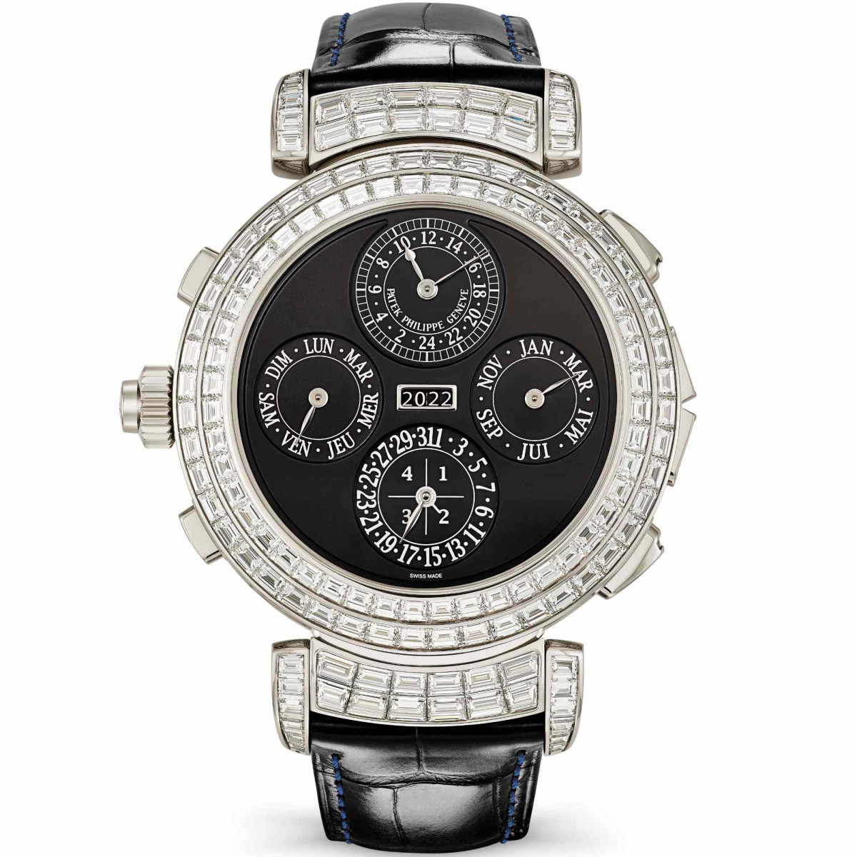 Ref. 6300/401G-001 - Exklusives Dekor aus Baguette-Saphiren für die komplizierteste Armbanduhr von Patek Philippe. Die Patek Philippe Grandmaster Chime wurde 2014 anlässlich des 175-jährigen Manufakturjubiläums vorgestellt. In einem Weißgoldgehäuse sowie mit schwarzen und weißen Zifferblättern fand sie 2016 ihren Platz in der aktuellen Kollektion. 2019 folgte eine Weißgold-Variante mit zwei opalblauen Zifferblättern (Referenz 6300G-010).