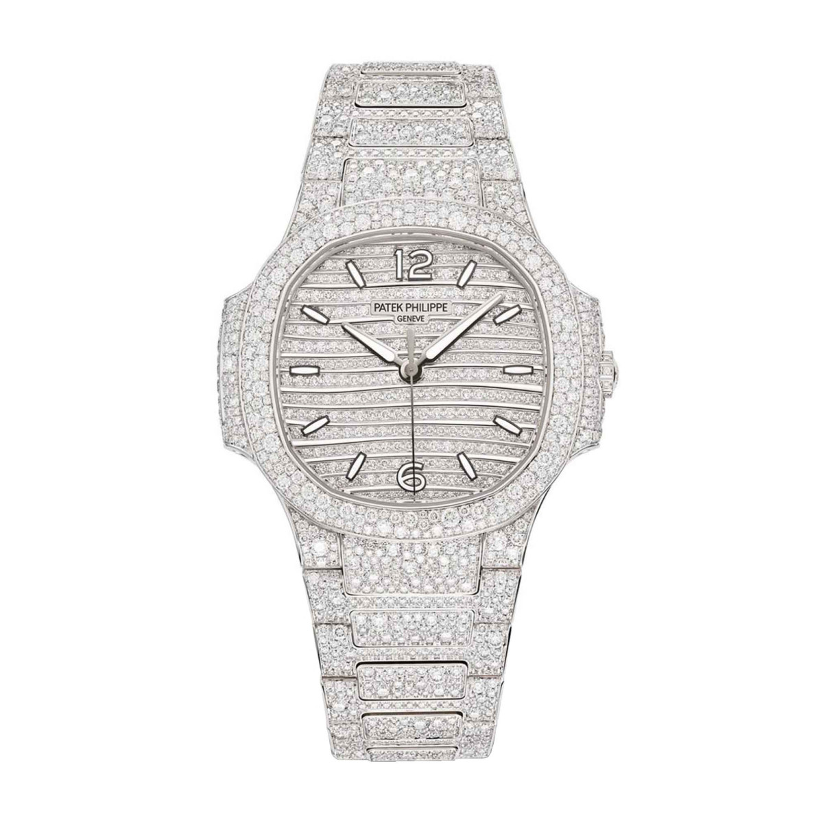 Ref. 7118/1450G-001 - Patek Philippe hat die Nautilus Haute Joaillerie, Referenz 7118/1450, neu interpretiert: Das aktuelle Modell aus Weißgold wurde durch Snow Settings auf Gehäuse, Lünette und Armband veredelt. Das Zifferblatt blendet uns durch den Glanz von Edelsteinreihen in der Form kleiner Wellenreliefs – ein charakteristisches Merkmal der Nautilus Damenkollektion. Der Aufbau und die sorgfältig gearbeiteten Finissierungen des Kalibers 324 S mit automatischem Aufzug sind durch den transparenten Saphirglasboden für den Betrachter erkennbar. Das Armband verfügt über eine patentierte Patek Philippe Sicherheitsfaltschließe mit vier voneinander unabhängigen Rasten. Die neue Nautilus Haute Joaillerie blendet uns durch das Funkeln von 2553 Diamanten im Brillantschliff (ca. 12,69 K) in lupenreiner Top Wesselton Qualität.