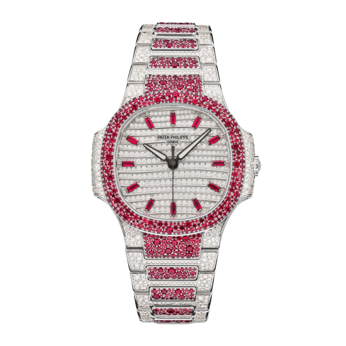Ref. 7118/1452G-001 - Eine neue Variante mit in der Snow-Setting-Technik gefassten Diamanten und Rubinen. Mit der neuen Nautilus Haute Joaillerie Damenuhr in Weißgold mit 1.500 Diamanten (6,53 K) und 876 Rubinen (6,58 K) stellt Patek Philippe seine ganze Kunst des Edelsteinbesatzes unter Beweis. Um diesem edlen Schmuckstück unvergleichlichen Glanz zu verleihen, hat die Manufaktur die äußerst raffinierte Snow-Setting-Technik gewählt. Die Rubine auf der Lünette, dem Zifferblatt und den Mittelgliedern des Armbands betonen das ikonische Design des Modells mit seinem Gehäuse, das einem Bullauge ähnelt, und dem integrierten Armband mit in drei Reihen angeordneten Gliedern.