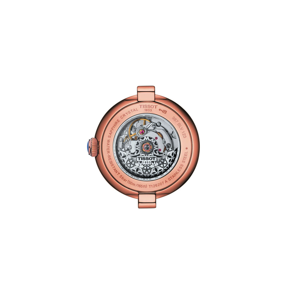 Dieses Modell besitzt ein Swiss Made Automatikwerk mit patentierter, amagnetischer Nivachron-Spirale und bis zu 48 Stunden Gangreserve, kratzfestes, gewölbtes und entspiegeltes Saphirglas sowie einen gläsernen Gehäuseboden. Römische Ziffern, gebläute Zeiger, die kleine Datumsanzeige bei 6 Uhr und nicht zuletzt der blaue Cabochon auf der Krone verleihen der Tissot Bellissima Automatic eine elegante Optik.