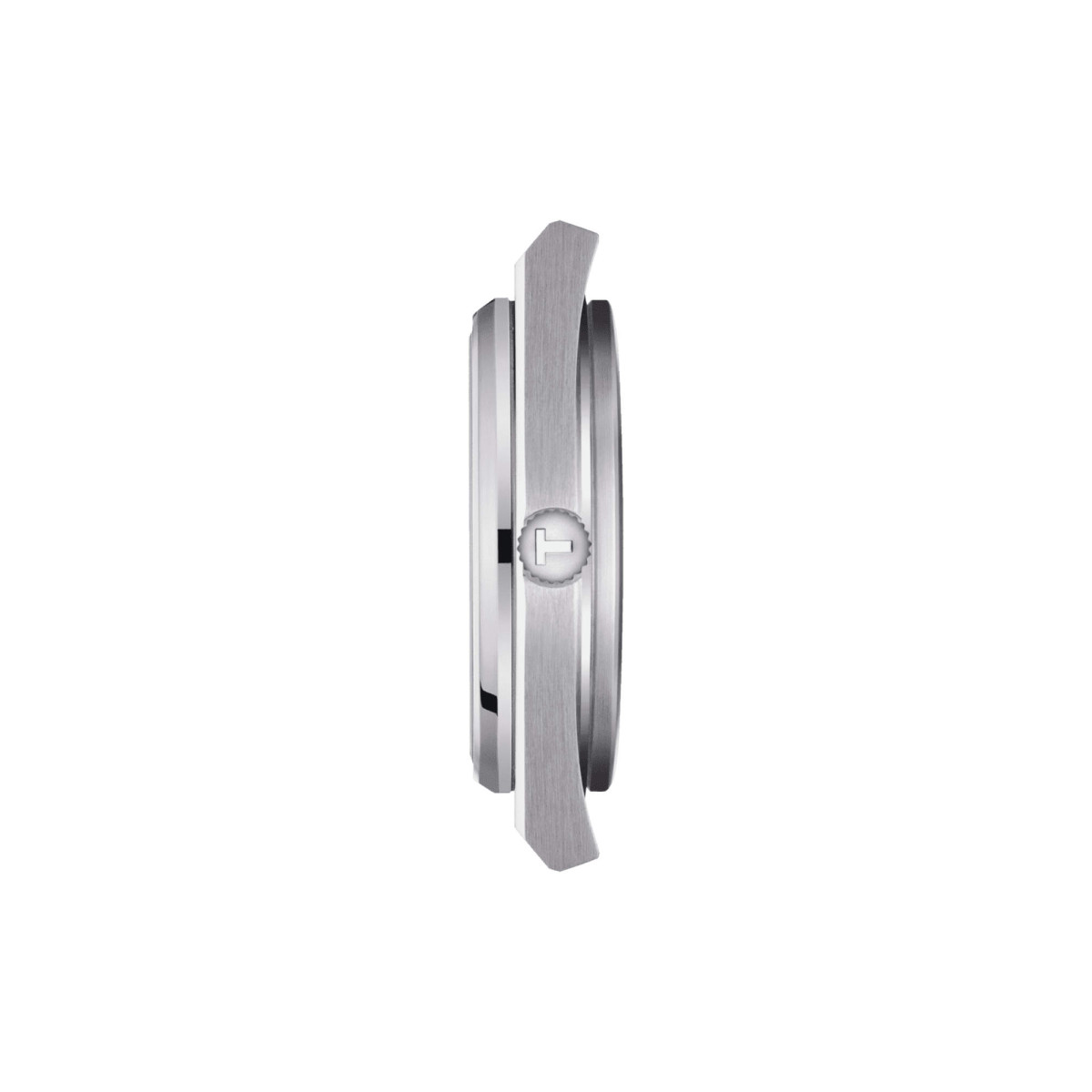 Ref. T137.407.17.051.00 - Das 316L-Edelstahlgehäuse der Tissot PRX hat einen Durchmesser von 40 mm. Es weist eine leichte Tonneau-Form auf und wird von einer schmalen, runden Lünette geziert. An den Seiten wechseln sich vertikal gebürstete, abgerundete Finishes mit polierten Facetten ab.