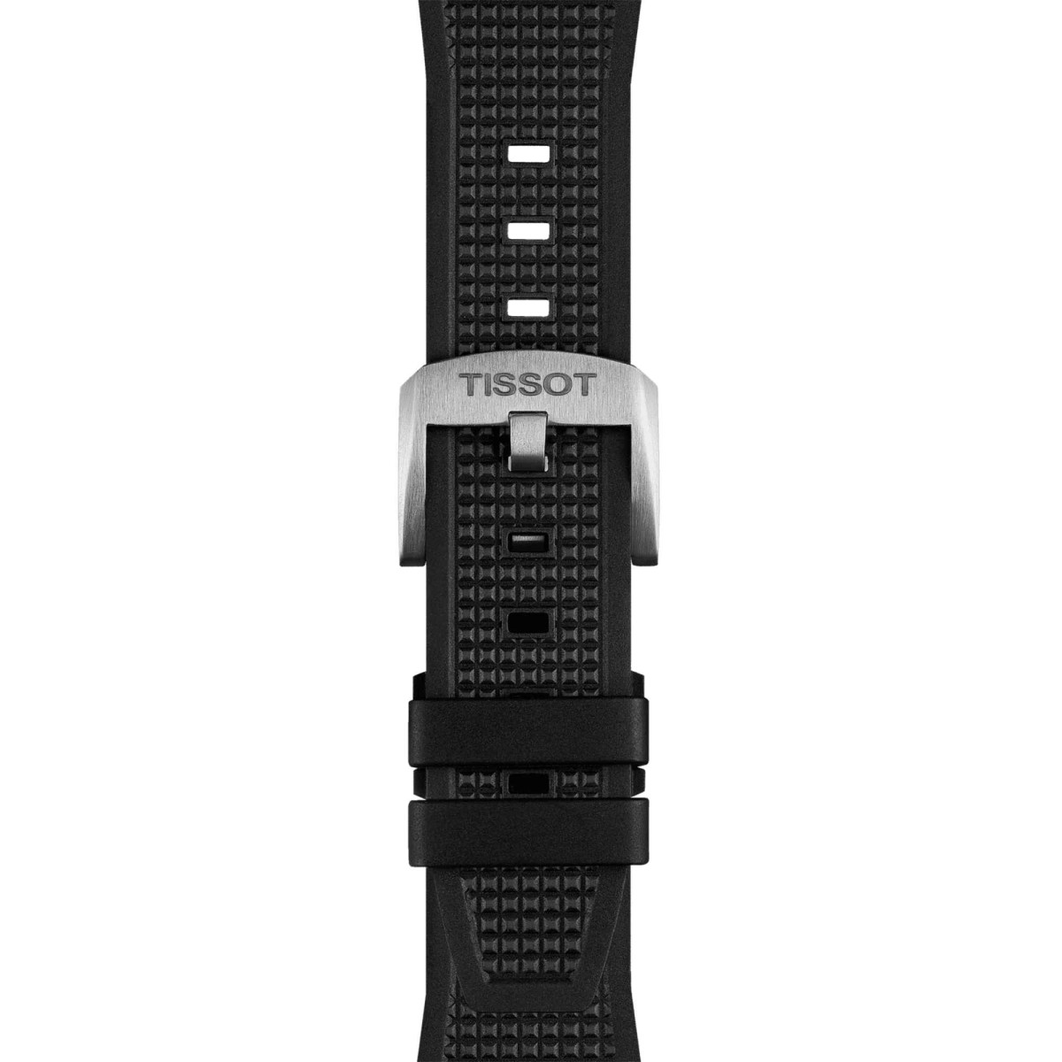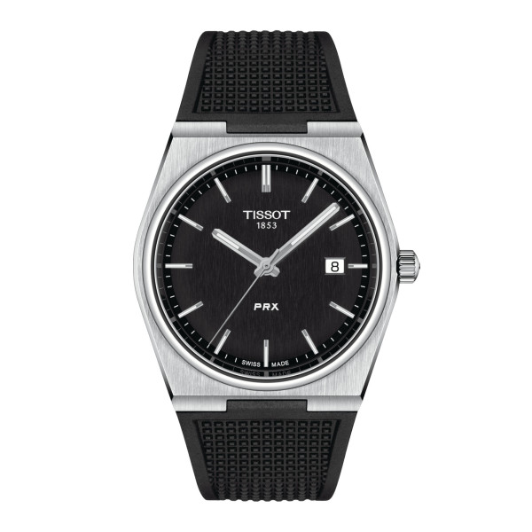 Diese Ausführung der Tissot PRX Powermatic 80 besitzt ein schwarzes Zifferblatt mit Indizes und ein schwarzes Kautschukarmband mit Schnellwechselsystem und Dornschließe.