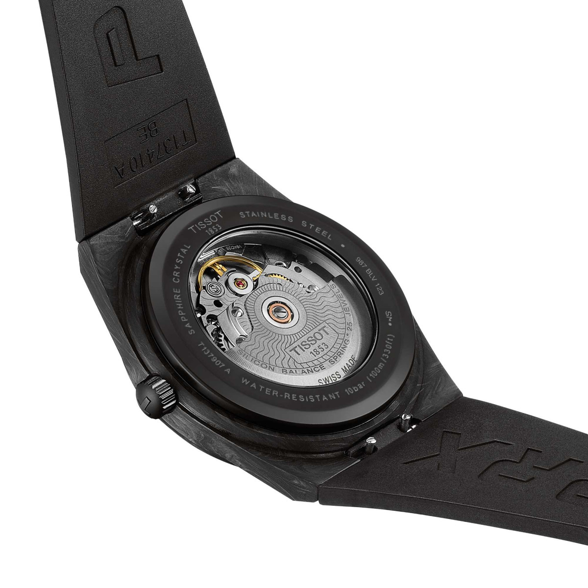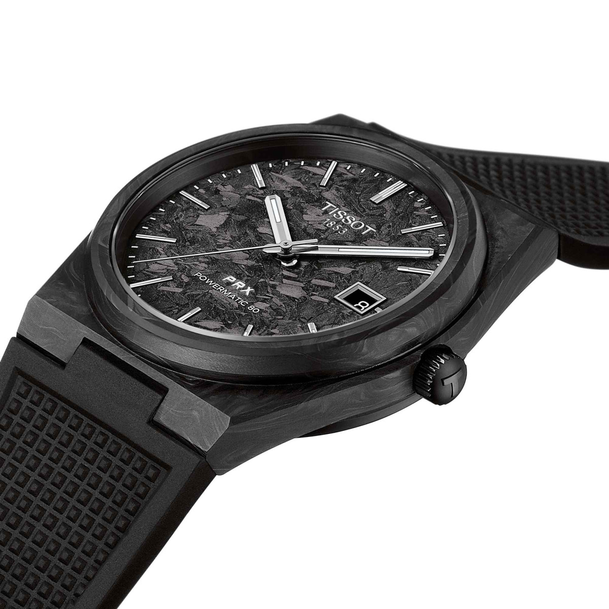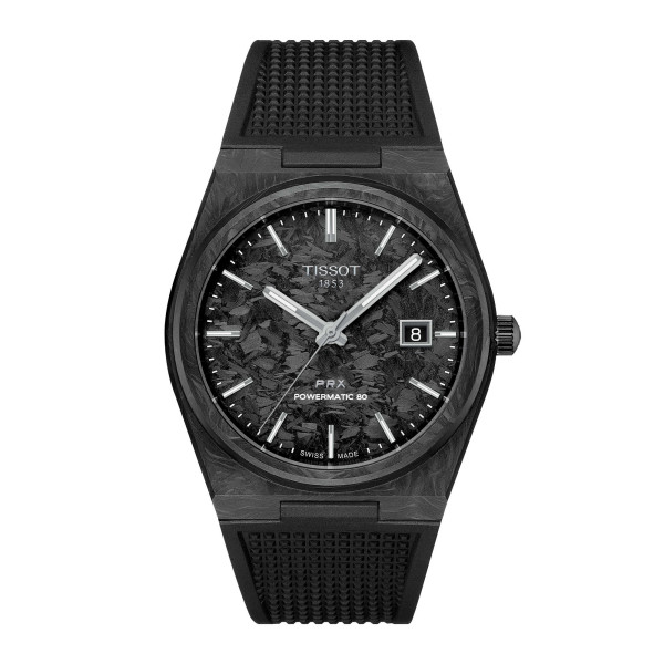 Ref. T1379079720100 - Diese Erweiterung der legendären Tissot PRX Powermatic 80 mit 40 mm Gehäusedurchmesser verfügt über ein schwarzes, marmoriertes Carbon-Gehäuse. Das innovative Material macht jede Uhr einzigartig und sorgt für wenig Gewicht und Langlebigkeit. Es wurde für optimale Leistung unter anspruchsvollen Bedingungen entwickelt und ermöglicht es, an Grenzen zu gehen und diese zu verschieben. Der perfekte Begleiter für urbane Abenteurer, die sowohl Funktionalität als auch markanten Style suchen.