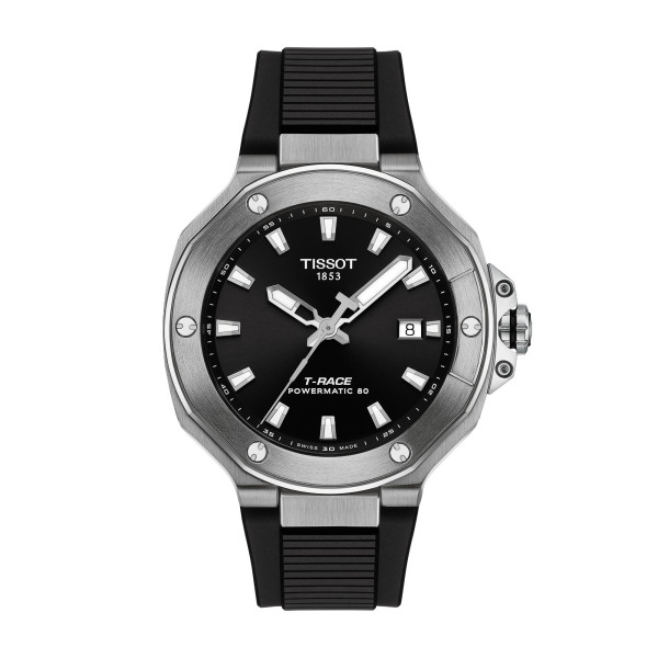 Diese Tissot T-Race Powermatic 80 40mm Ausführung besitzt ein robustes 316L-Edelstahlgehäuse mit 40 mm Durchmesser, sehr kratzfestes, entspiegeltes Saphirglas und ein schwarzes Zifferblatt mit Datumsanzeige. Zeiger und Indizes sind großzügig mit SuperLuminova® Leuchtbeschichtung versehen, was auch bei schwierigen Lichtverhältnissen beste Ablesbarkeit garantiert. Das flexible, schwarze Silikonarmband verfügt über eine Dornschließe.