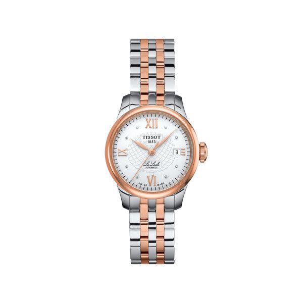 Ref. T41.2.183.16 - Die Tissot Le Locle Automatic verkörpert die Handwerkstradition von Tissot. Benannt nach der Heimatstadt der Marke im Schweizer Juragebirge, passt diese Uhr perfekt zu Damen, die zeitlose Eleganz und Schweizer Uhrmachertradition suchen. Zu den Merkmalen dieser Damenuhr gehören ein Swiss Made Automatikwerk, ein kratzfestes Saphirglas, ein Bicolor 316L - Edelstahlgehäuse mit rosegoldfarbener PVD-Beschichtung sowie eine Datums-Anzeige. Dieses klassische Modell aus der Le Locle Automatik Kollektion hat ein silberfarbenes Zifferblatt mit römischen Ziffern, welches mit 8 Diamanten verziert ist. Das massive Biclor 316L - Edelstahlarmband mit rosegoldfarbener PVD-Beschichtung besitzt eine Butterfly-Faltschließe mit Drückern.