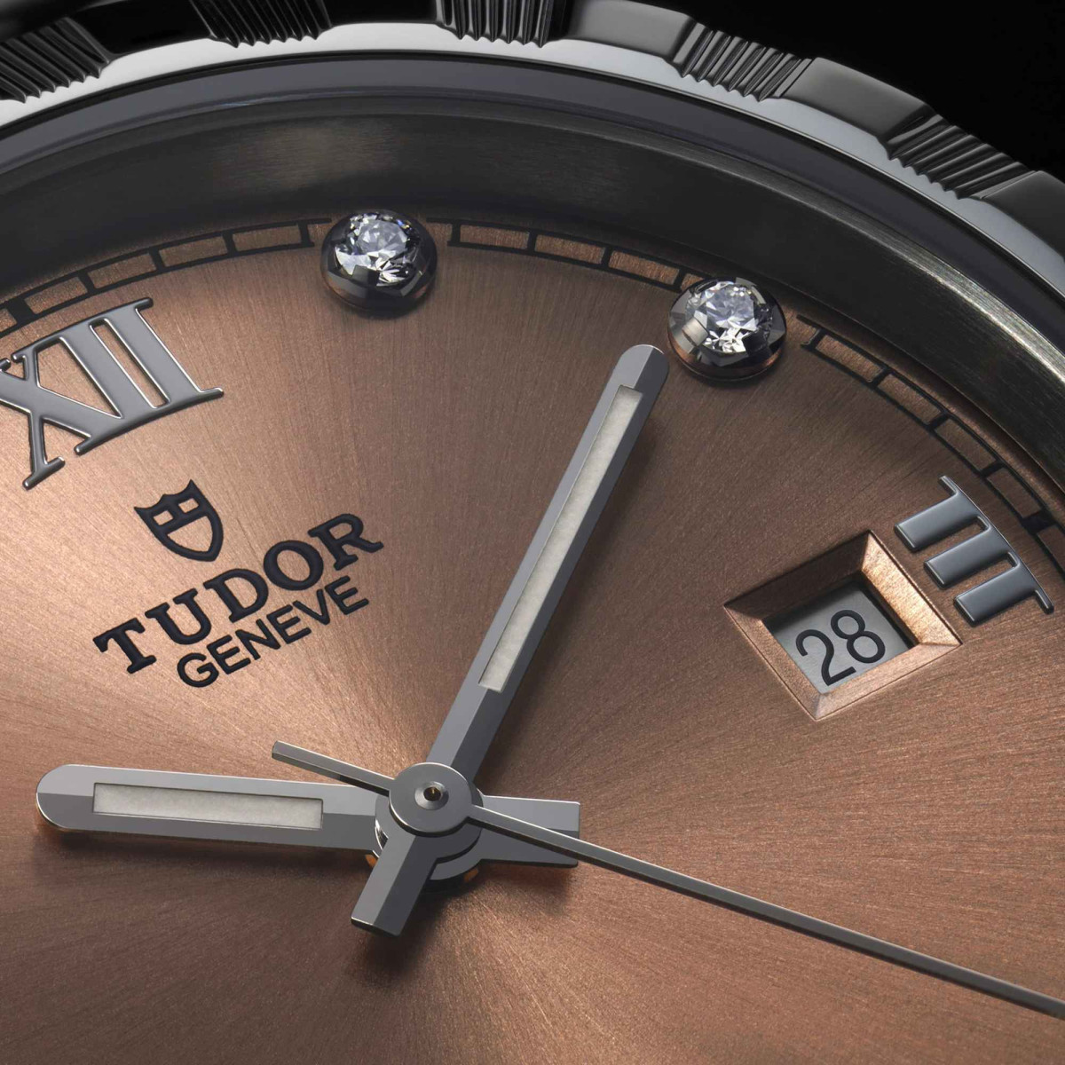 Ref. M28300-0010 - TUDOR hat die Auswahl an Zifferblättern der beliebten Royal Linie um ein lachs- sowie ein schokoladenfarbenes Zifferblatt im Sonnenschliff erweitert, die durch eine überraschende und erlesene Optik überzeugen. Die Royal Linie bietet sportliche und schicke Uhren mit Selbstaufzug sowie integrierten Armbändern, die sich durch Erschwinglichkeit und Eleganz gleichermaßen auszeichnen. Eine herausragende technische Leistung und eine raffinierte Ästhetik; diese Linie verkörpert eine Mischung aus klassischer Armbanduhr und Sportuhr. Der Name „Royal“ wurde von TUDOR erstmals in den 1950er-Jahren verwendet, um die herausragende Qualität seiner Armbanduhren hervorzuheben, die bis heute Bestand hat. Die Royal ist in Edelstahl oder in Gelbgold und Edelstahl sowie in vier Größen mit insgesamt dreizehn verschiedenen Zifferblättern für jeden Geschmack erhältlich. Alle Zifferblätter verfügen über diese applizierten Ziffern oder eine Kombination aus applizierten Ziffern und acht Diamantindizes.