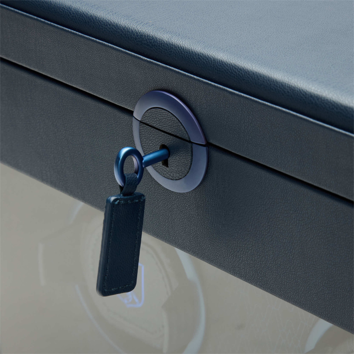 Ref. 190517 - Der Earth Triple Watch Winder aus der Kollektion zum 190-jährigen Jubiläum vereint innovatives Design, Eleganz und Nachhaltigkeit. Er verfügt über ein Äußeres aus Apfelleder mit farblich abgestimmten, matten Metallbeschlägen und Einfassungen, kombiniert mit einem Innenfutter aus recycelter Jacquard-Seide mit dem charakteristischen WOLF-Muster. Das Dynamic Lock-in Cuff ist an drei verschiedene Handgelenkgrößen anpassbar und sichert Ihre Uhren im Inneren des Uhrenbewegers. Stellen Sie die gewünschte Anzahl an Umdrehungen pro Tag und die Richtung für Ihre drei Uhren individuell über die WOLF Bluetooth-App ein. Im oberen Stauraum finden Sie fünf hängende Uhrenkissen und eine herausnehmbare Ablage für Accessoires mit mehreren Fächern für Ihre Wertsachen.